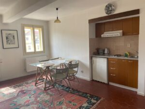 The space includes a fully equipped kitchen with a large dining table, a separate bedroom, and a bathroom with shower, bathtub, and toilet.